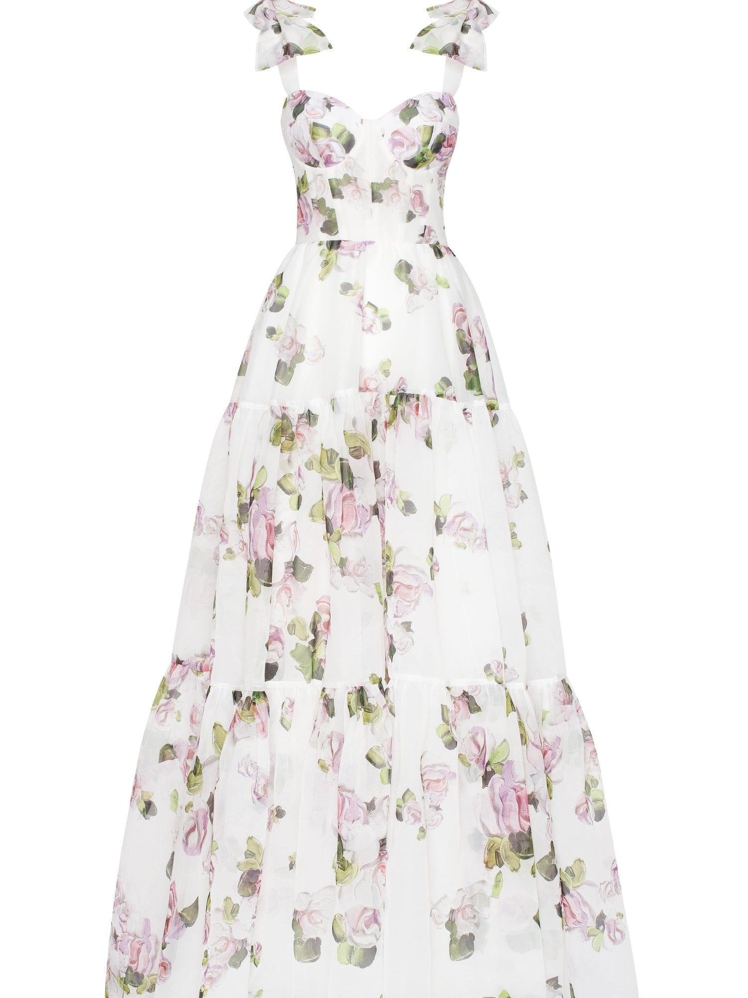 tender tie-strap maxi dress is made of organza. The gown has a tiered full skirt. The bodice of the dress has a lace-up corset with straps. The gown is created in blush pink and pastel green floral prints.