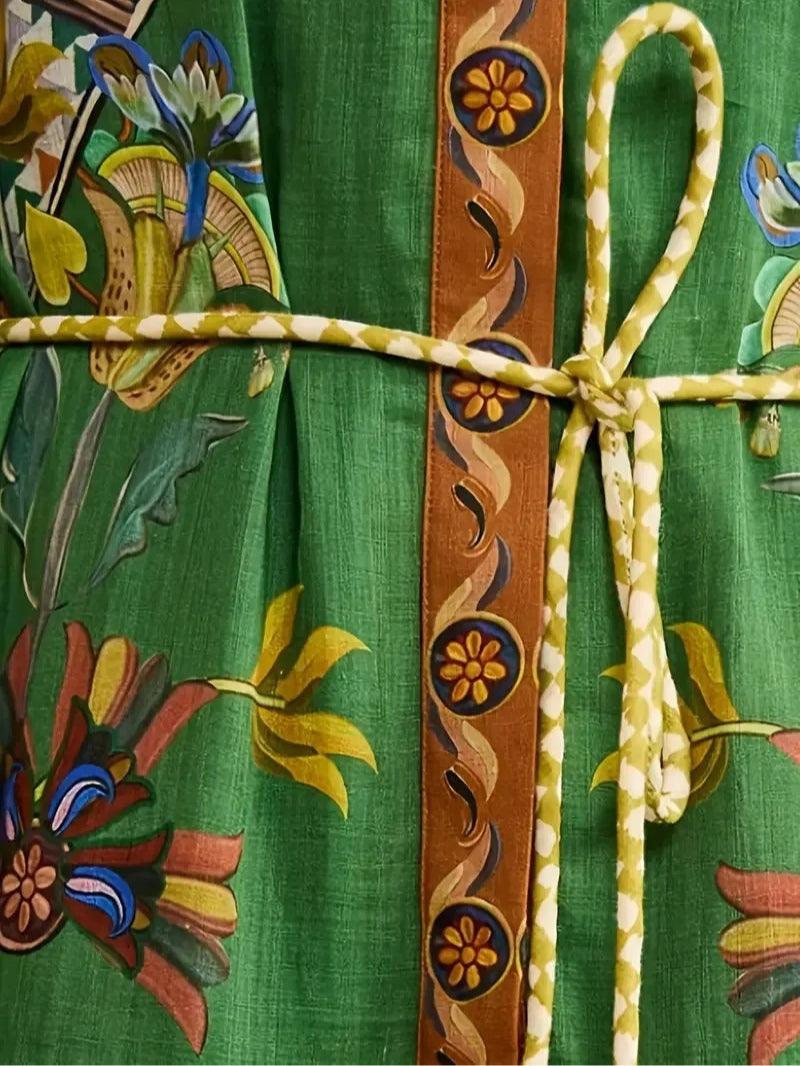 Step into autumn with style in our printed maxi cardigan dress. Crafted from polyester, it combines boho charm with elegance. Featuring a collared neckline and lantern sleeves, it offers a sophisticated silhouette. The wide hem and floral pattern add a touch of whimsy, while the belted waist and button element enhance the overall look.