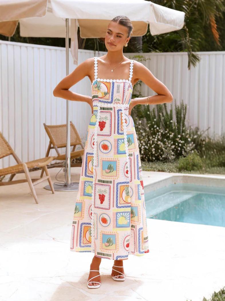 This Suspender Midi Dress in Summer Graffiti print is the perfect addition to your summer wardrobe. Made with high-quality materials, it offers a comfortable fit and a unique, eye-catching design. The suspenders add a touch of playfulness to this elegant dress, making it perfect for any occasion.